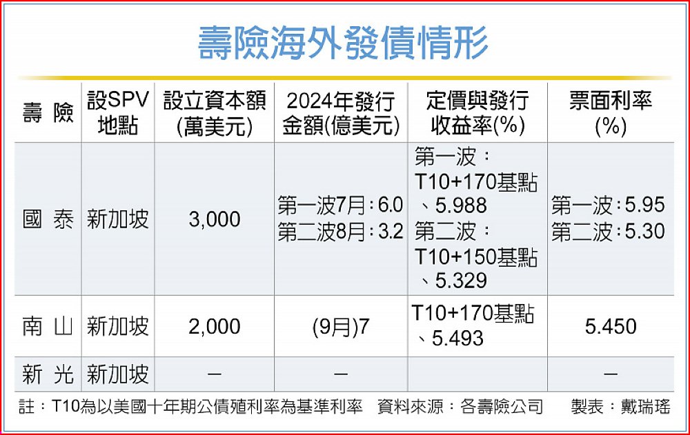 去年已啟動海外發債的兩家壽險,國泰人壽因去年已完成發債目標,今年暫時沒有國內外發債計畫;南山人壽去年剛發完300億元次債,去年底董事會再通過200億元的發債額度,200億元額度除國內發債外,也不排除今年再啟動第二波海外發債。