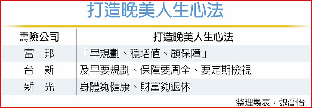 新光人壽強調,晚美人生二要素,即身體夠健康、財富夠退休,在經費有限下,不妨先以具有住院、手術、處置、醫材、壽險等多元保障的醫療險為主,再搭配特定險-重大傷病險,藉此建立基本醫療保護傘,更能防範措手不及的重大傷病風險,行有餘力者,再補足長照險。