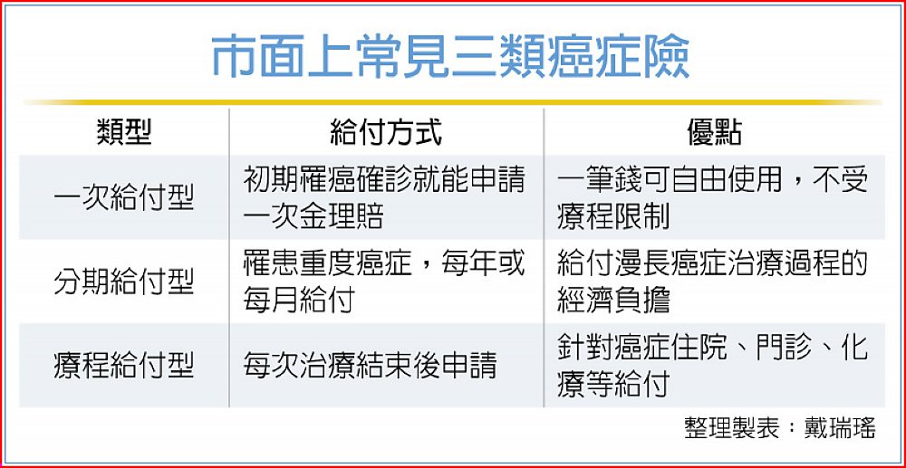 建議可先投保高保額的「癌症一次給付型」商品,在初次罹癌時即給付一筆保險金,以因應癌症初期發生的大筆醫療等費用,保額建議設定在200萬~300萬元之間,因應即時的醫療費用和失去經濟來源的雙重衝擊;後續治療則可透過「分期給付型」和「癌症療程給付型」補強,以獲得妥善而完整的療程照護。