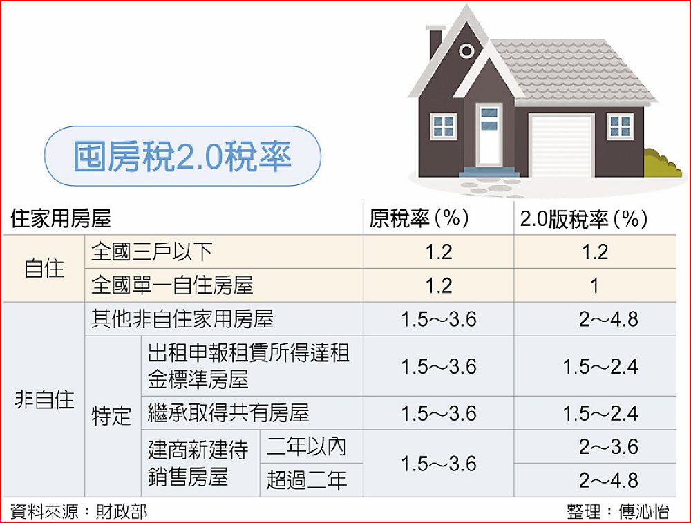 其中,民眾及配偶名下僅一戶自住房屋(即全國單一自住),如果符合排富條款(即房屋現值低於豪宅標準),房屋稅率可自1.2%降至1%;至於住家用自住房屋以三戶為限,第四戶起就必須依各地的囤房稅課徵較高稅率。