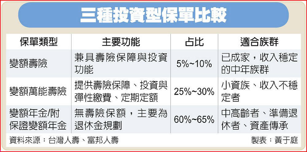 關於上述三種投資型保單的差異,台灣人壽說明,變額年金險多用作退休金規劃,透過附保證型商品連結全委帳戶投資累積資產,年金累積期間享身故保證金額、退休後可領取年金;變額萬能壽險提供壽險保障、投資和彈性繳費優勢;變額壽險則兼具壽險保障與投資功能,由投保人選擇投資標的,死亡保險金額為基本保額加上投資價值。