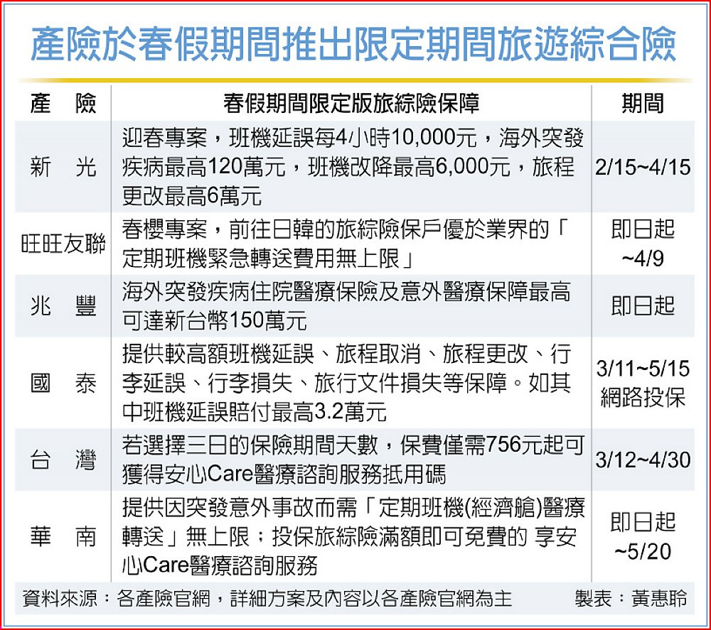 春季是旅遊旺季卻是氣候多變,也是流行性型感冒好發的季節,根據兆豐保險統計,2024年國外旅行綜合保險的海外突發疾病前三大理賠項目,分別為流行性型感冒、腸胃炎、尿道及泌尿道疾患。因此為避免海外就醫傷荷包,產險業者強烈建議民眾出國前投保國外旅綜險,為自己建構完整的保障防護網。