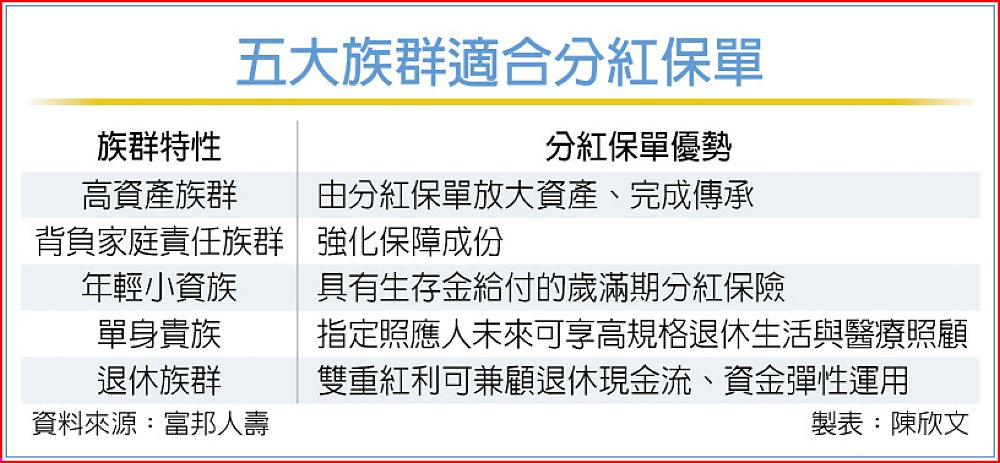 富邦人壽表示,分紅保單具有高保障、資產累積與分紅等特性,且分紅的方法方式多元,除適合沒有時間自行研究、希望交由保險公司的專業團隊進行穩健投資的上班族外,想代代傳富而不是富不過三代,可藉由分紅保單放大資產,透過保單要保人、被保險人及指定身故受益人的安排,完整將資產傳承後輩。
