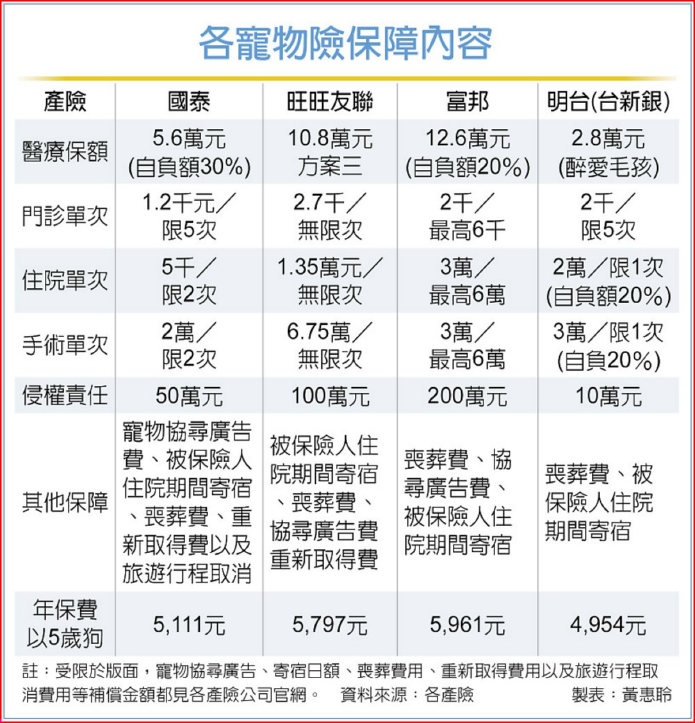 2025年仍只有四家產險推出寵物險,各家寵物險雖「大同」仍有些「小異」。旺旺友聯產險說,網路投保寵物險只要約莫5分鐘就能完成投保流程,投保旺旺友聯寵物險要理賠申請僅須前往指定獸醫院就診,不用再向獸醫院索取相關單據,即可申請理賠,大幅簡便理賠申請流程及提升時效。由於旺旺友聯寵物險的醫療費用無自負額、保期內理賠次數無上限以及寵物續保年齡無上限等都是該公司寵物險的特色。