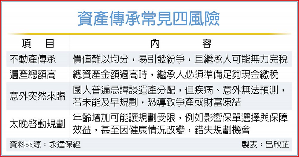 永達保經表示,財富傳承過程常見四大風險,一是不動產傳承,由於價值難以均分,易引發紛爭,且繼承人可能無力完稅;二是遺產總額高,當總資產金額過高時,繼承人必須準備足夠現金繳稅;三是意外突然來臨,國人普遍忌諱談遺產分配,但疾病、意外無法預測,若未能及早規劃,恐導致爭產或財富凍結;四是太晚啟動規劃,隨著年齡增加可能讓規劃受限,例如影響保單選擇與保障效益,甚至因健康情況改變,錯失規劃機會。
