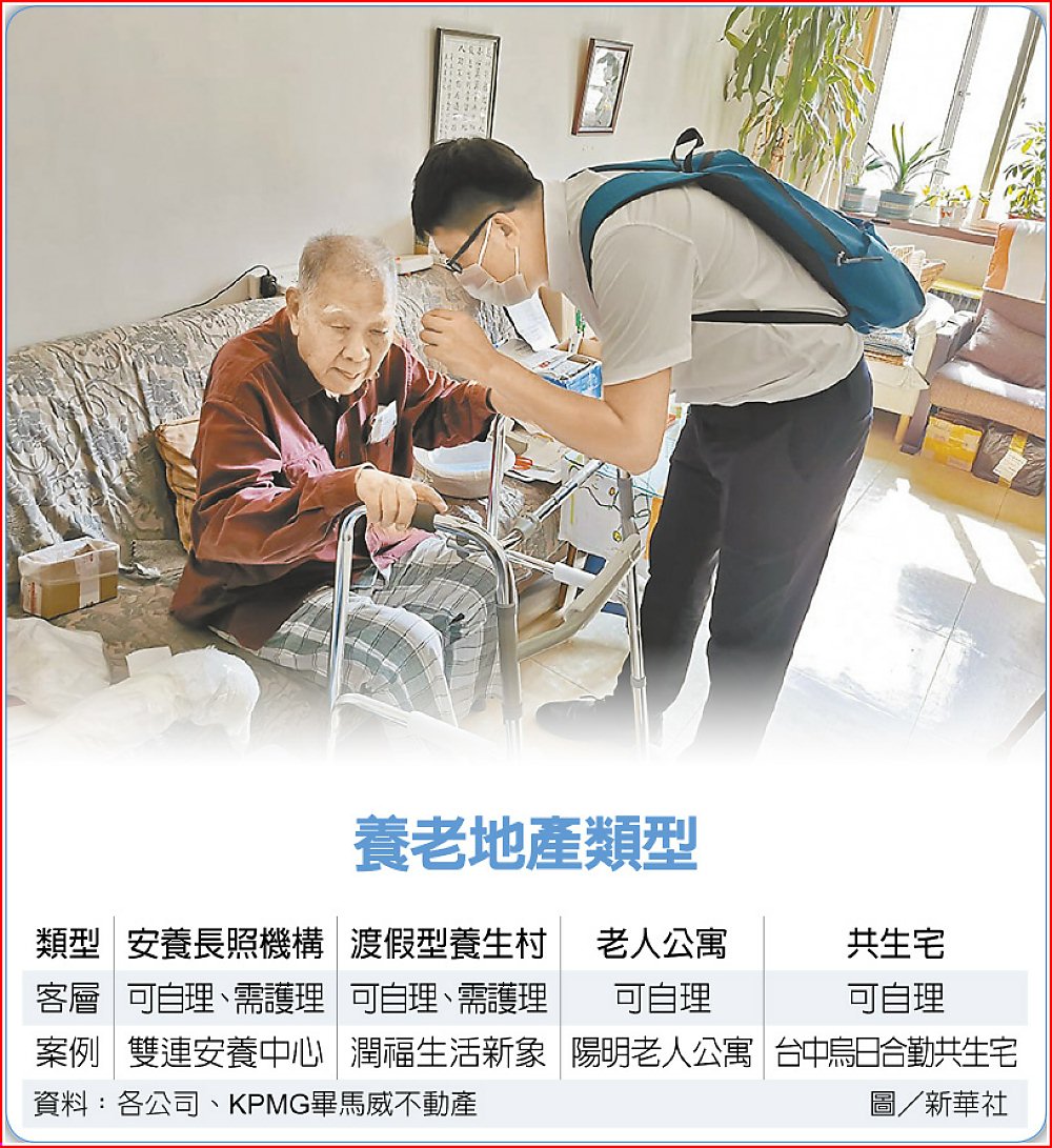 台灣65歲以上人口達20.1%、逾470萬人,衍生龐大銀髮商機,帶動可觀的養老地產需求,除過去傳統單一以醫療照護為主的機構,市場上也興起一些以服務導向的渡假式養生村、及價格合理的老人公寓、創新型態的青銀共居宅,及政府推動的社會住宅,都是台灣養老居住的新選擇。