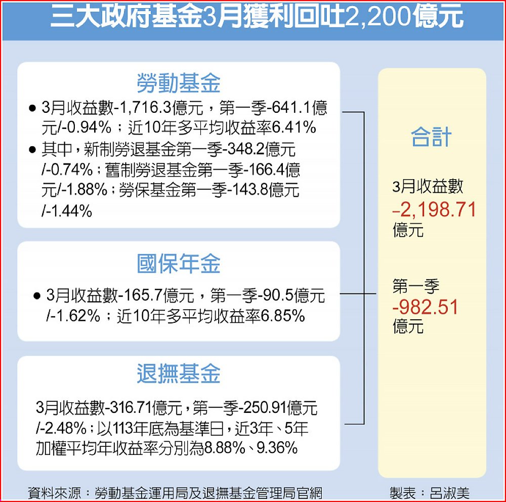 此外,受衛福部委託管理的國保年金3月收益負165.7億元,累計第一季虧損90.5億元、收益率負1.62%;另受農業部委託的農退基金基金規模雖不大,但因國內投資配置較高,受國內市場波動影響明顯,收益率為負3.73%。