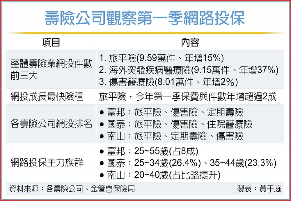 富邦人壽表示,旗下網路投保平台最受歡迎的前三大產品依序為旅平險、傷害險與定期壽險。其中,旅平險受惠於國人出國旅遊熱潮持續,今年第一季保費成長約2成,成為成長幅度最大的險種。