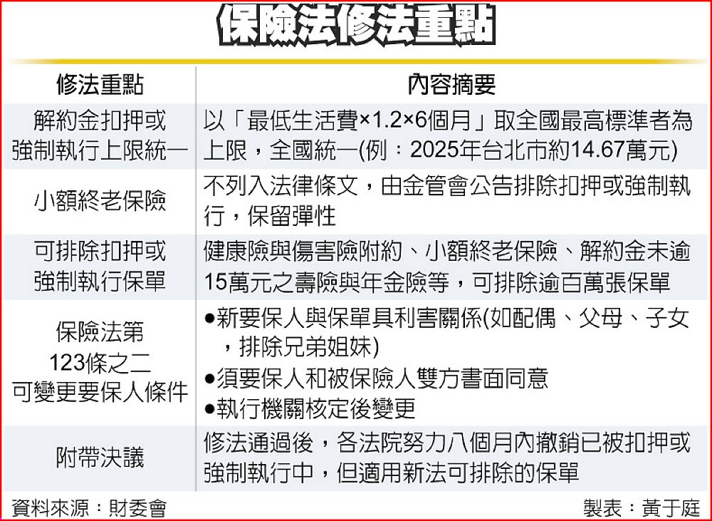 另外,有部分保單可排除強制執行,從壽險公司調查的保單件數、前兩年被強制執行的123萬張保單中,約可排除74%健康險和傷害險附約,剩下26%的小額終老保險,以及人壽和年金保險契約解約金未逾15萬元者,約可再排除一半,共可排除近9成、逾百萬張保單,減輕各法院執行案量。