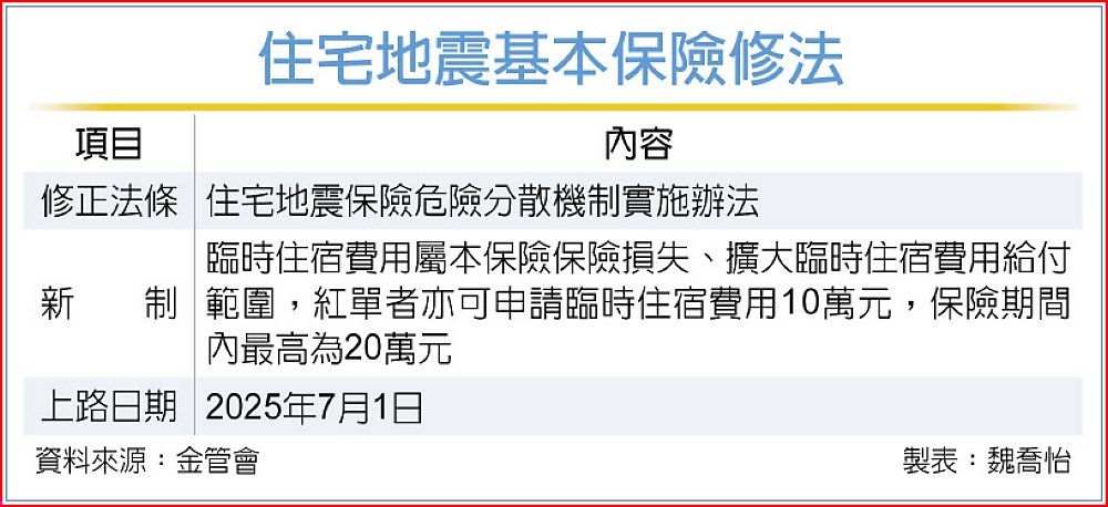 蔡火炎指出,這次修法有二大重點,一是考量現行給付範圍已包含臨時住宿費用,因應擴大臨時住宿費用給付範圍,修正明確臨時住宿費用屬本保險保險損失;二是擴大臨時住宿費用給付範圍。保險標的物因地震發生,經直轄市、縣(市)政府依內政部訂定發布之災害後危險建築物緊急評估辦法辦理緊急評估,緊急評估結果有危險之虞並張貼紅色危險標誌者,財產保險業支付臨時住宿費用,每一保險標的物為10萬元,以即時提供被保險人臨時住宿所需,臨時住宿費用於保險期間內合計最高為20萬元。