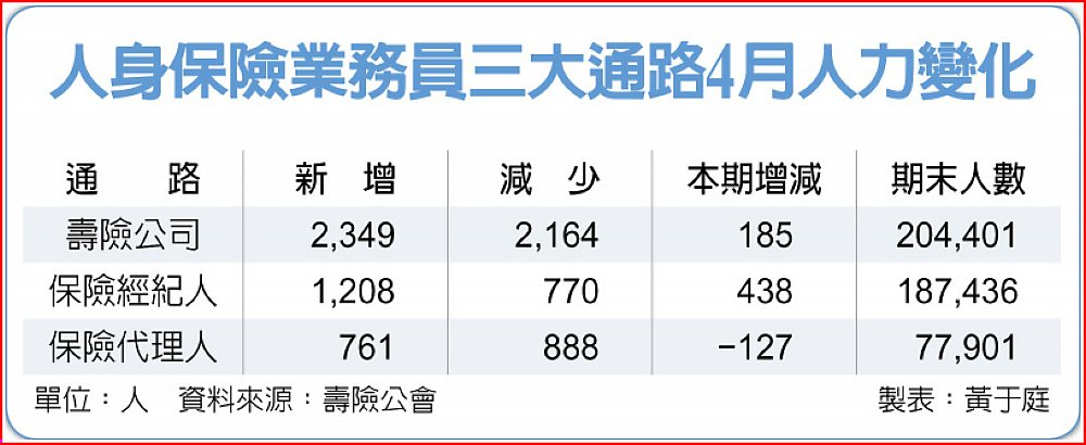 統計指出,保經公司新增業務員總數為1,208人,扣除異動後淨增438人,居三大通路中業務員人數淨增長最多;壽險公司4月新增人數2,349人,實際淨增185人;保代公司僅新增761人,出現127人淨減,顯示競爭壓力加劇、人力流動加速較明顯。