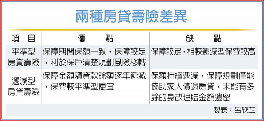 遞減型房貸壽險優點則是保障金額會隨著貸款餘額逐年遞減,臺銀表示,其保費較平準型便宜,但缺點是保額持續遞減,保障規劃僅能協助家人償還房貸,未能有多餘的身故理賠金額遺留給家人。兆豐銀行指出,平準型房貸壽險保障高,但無現金價值累積;減額型房貸壽險保費具經濟效益,但建議需另搭配其他保障型保單。