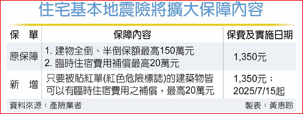 在不影響危險承擔總額及保險費率前提下,住宅地震保險基金說明,將於7月15日起擴大承保建築物因地震發生且符合內政部災害後危險建築物緊急評估辦法辦理張貼「紅色危險標誌」標準者,給付臨時住宿費用10萬元,每張保單於保險期間內最高仍以20萬元為限,期待解決過往投保住宅需達到「全損」程度才能理賠的無感問題,以強化本保險救急救難的功能。這次擴大臨時住宿費用給付範圍是2025年7月15日起的有效保單皆自動適用。
