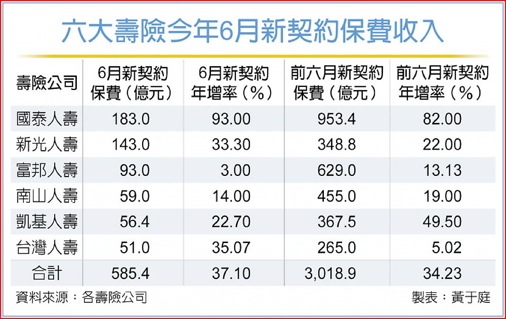六大壽險今年6月新契約保費收入