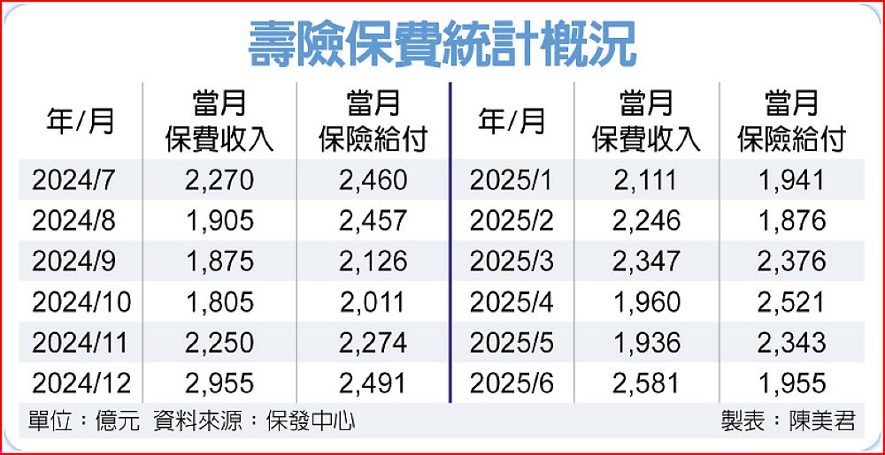 保發中心數據顯示,今年上半年總保費收入達1兆3,181億元,保險給付為1兆3,012億元,收入扣除給付後,保費現金淨流入169億元。