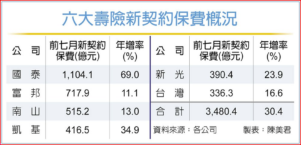 據各公司公告資訊,壽險龍頭國泰人壽前七月新契約保費破1,100億元、高達1,104.1億元奪下冠軍,年增率飆至69%;富邦人壽積極強化分期繳及保障型商品推動,今年前七月新契約保費717.9億元居次,年增11.1%;南山人壽前七月新契約保費515.2億元排名季軍、年增13%。