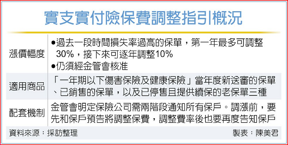 消息指出,適用調費機制的保險商品為「一年期以下傷害保險及健康保險」當年度新送審的保單、已銷售的保單,以及已停售且提供續保的老保單三種,但不含團體保險、旅行平安險、豁免保費等。
