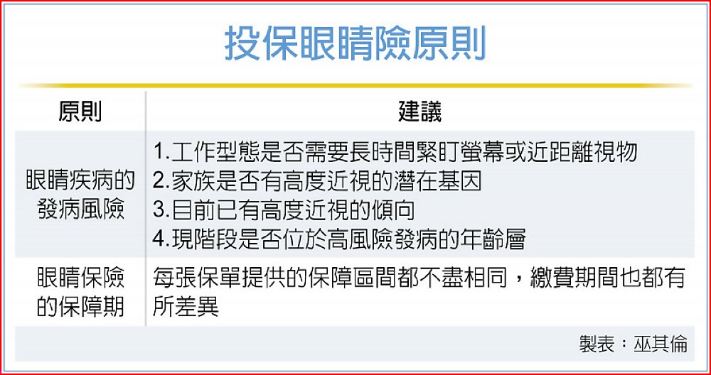 三是眼睛保險的理賠項目,國人常見的眼疾多為青光眼、白內障、黃斑部病變與視網膜剝離等四項,病情嚴重者會需要動手術進行治療,在購買眼睛保險保單的時候要特別留意理賠項目是否足夠,除了手術理賠,是否還兼具眼疾處置療養理賠金、雙目失明是否也列入保險理賠的範圍,這些都是需要注意的部分,不可盲從大眾推薦,就忽略保單理賠的內容細節。