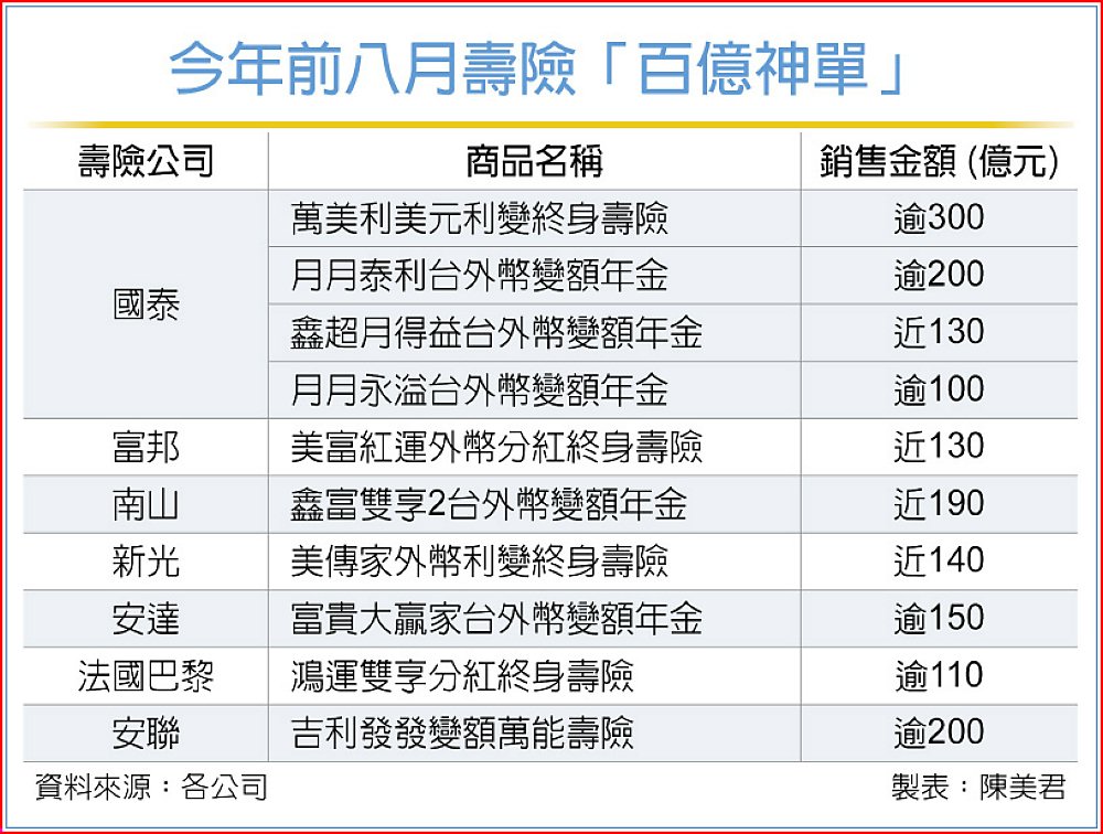 資料顯示今年前八月誕生的10張百億神單,分別是6張投資型、2張利變型及2張分紅保單。其中國泰人壽4張百億神單,分別是萬美利美元利變終身壽險、月月泰利台外幣變額年金、鑫超月得益台外幣變額年金,及8月新增的月月永溢台外幣變額年金。