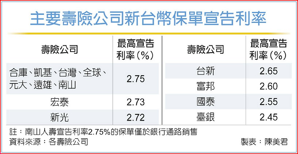 壽險業者近期紛紛發行高利新台幣保單搶攻市占率,包括合庫、凱基、台灣、全球、元大、遠雄、南山等壽險業者,最高宣告利率均達2.75%。圖/本報資料照片