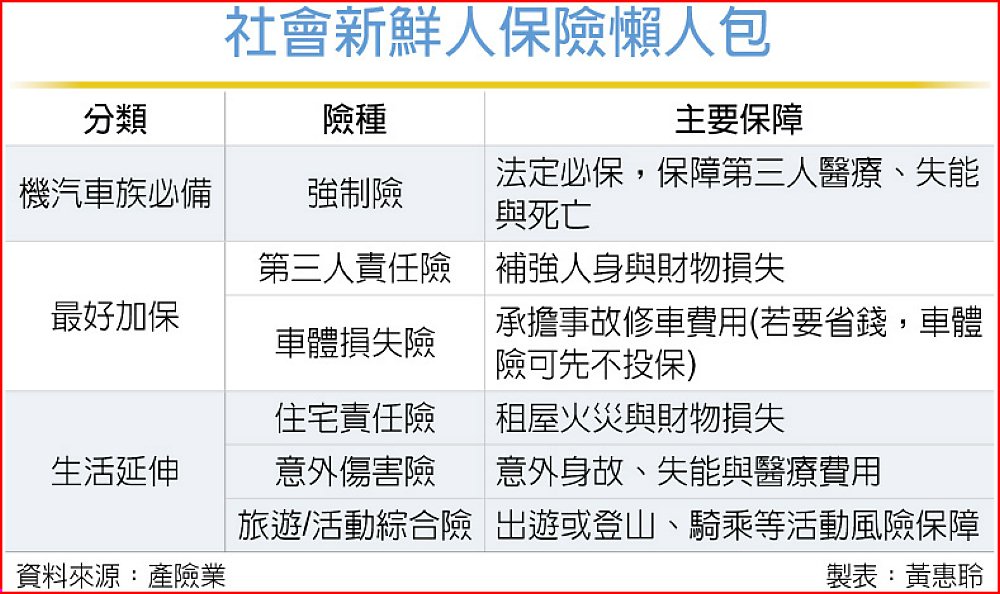 建議社會新鮮人從「強制險、第三人責任險、車體損失險」三重防護做起,再依生活型態加保住宅責任險、意外傷害險或旅遊綜合險,花少少保費即可換來大大安心。