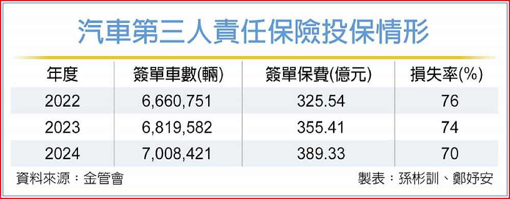 保險局副局長陳清源指出,汽車第三人責任保險2022年至2024年的簽單車數都在666萬輛以上,簽單保費則在325億元以上,車數跟保費每年逐步成長。損失率方面,2022年為76%、2023年為74%、2024年為70%。投保率方面,2022年為79%、2023年為79%、2024年為81%