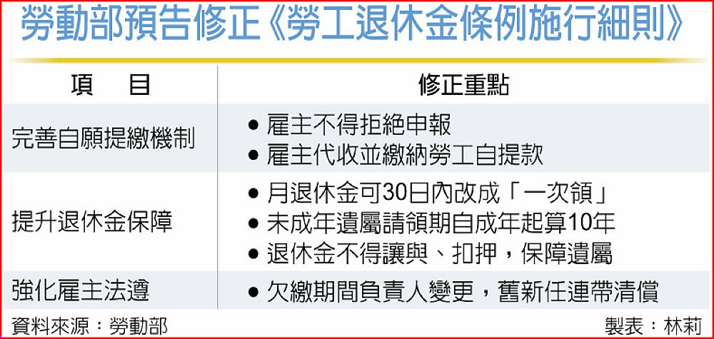 其餘修正內容亦同步強化勞工權益,包括未成年遺屬或指定請領人請求退休金的10年時效,改自成年日起算;退休金不得讓與、抵銷或扣押的保障範圍,擴及遺屬與指定請領人等,並提升勞工退休金的實質保障。