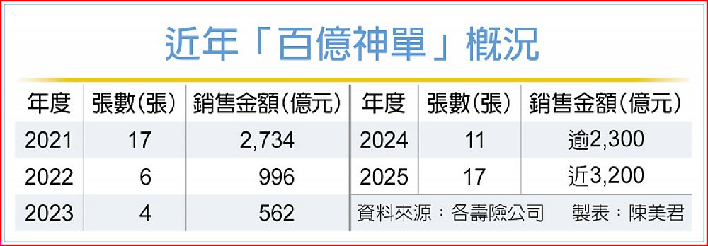 2025年12月新增兩張百億神單,包括富邦人壽的智富紅運外幣分紅終身壽險,及法國巴黎人壽金采年華變額萬能壽險/年金險(台、外幣),全年銷售金額近105億元與117億元。全年十家壽險誕生17張百億神單,金額超越2021年的2,734億元,寫下2019年以來、七年最高。17張裡有十張是投資型保單,三張利變型保單,另外四張為分紅保單。