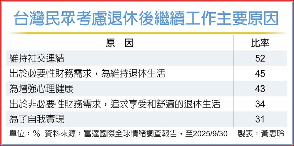 台灣民眾考慮退休後繼續工作主要原因