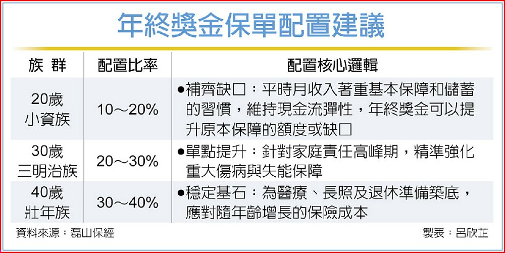 針對不同人生階段,年終獎金配置,建議20歲小資族,建議可配置10%~20%,平時月收入著重基本保障和儲蓄的習慣,維持現金流彈性,年終獎金可提升原本保障的額度或缺口;30歲三明治族可配置20%~30%,針對家庭責任高峰期,精準強化重大傷病與失能保障;40歲壯年族可配置30%~40%,為醫療、長照及退休準備築底,應對隨年齡增長的保險成本。