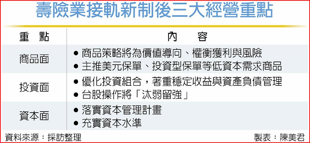 最受到矚目的是商品策略的具體做法,業者多認為應主推低資本需求商品,例如美元保單、投資型保單等商品,資金於台股的操作會採汰弱留強策略,當股市面臨修正時,資本不足的保險公司,也可能被迫拋售股票。