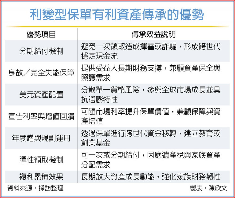 看準高資產族群對資產配置與傳承規劃的需求,市場亦推出結合美元資產與利變機制的保險商品。例如壽險業者與銀行合作推出的美元利率變動型終身壽險,從身故與完全失能保障出發,搭配宣告利率機制,當市場利率優於預定利率時,保戶可透過增值回饋金共享利差收益,在保障之外兼顧資產成長動能。