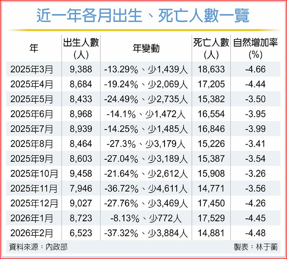 內政部指出,2月約每6.2分鐘出生一個嬰兒,折合年粗出生率為千分之3.65,是有紀錄以來單月出生人數最低的月份,相比去年同月份大幅減少了37.32%、少了3,884個新生娃,同樣是歷來跌幅最重的單月。