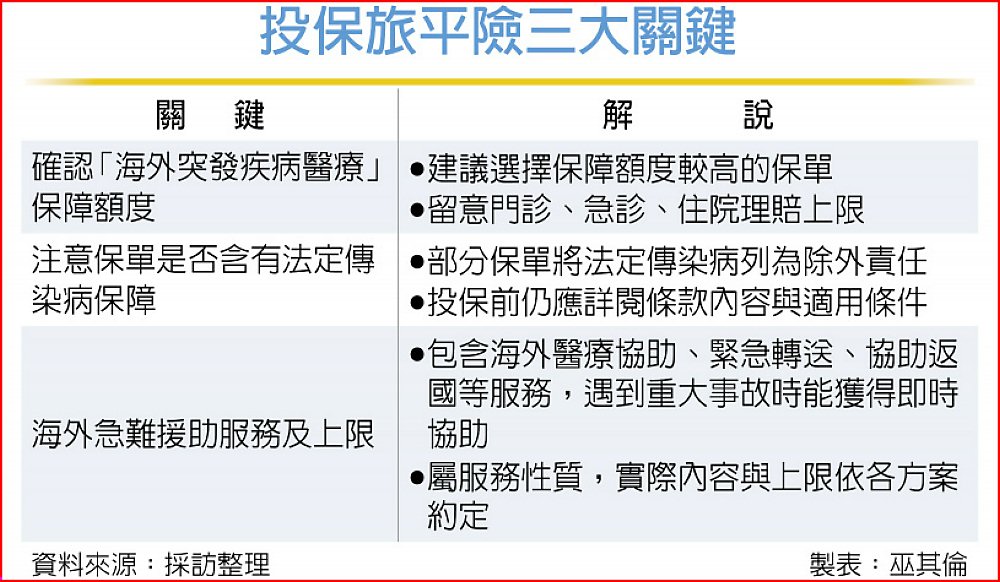 安達產險分析,投保前可留意三大關鍵點,首先是確認「海外突發疾病醫療」保障額度,通常會建議選擇保障額度較高的保單,並留意門診、急診、住院的理賠上限。其次是注意保單是否含有法定傳染病保障,有些保單將法定傳染病列為除外責任,民眾投保前仍應詳閱條款內容與適用條件。最後是海外急難援助服務及上限,包含海外醫療協助、緊急轉送、協助返國等服務,遇到重大事故時能獲得即時協助。屬服務性質,實際內容與上限依各方案約定。