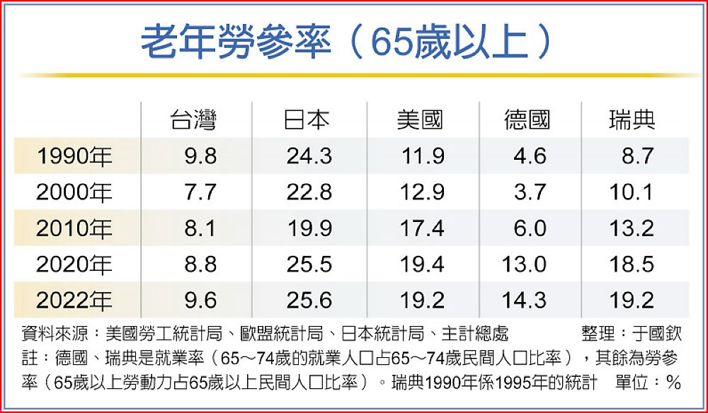 先看台灣,2000年老年人的勞參率不到8%,但2022年已逼近10%,再看同一期間的德國、瑞典更呈倍增,再如美國老年勞參率於去年也達到19.2%,日本更升至25.6%。