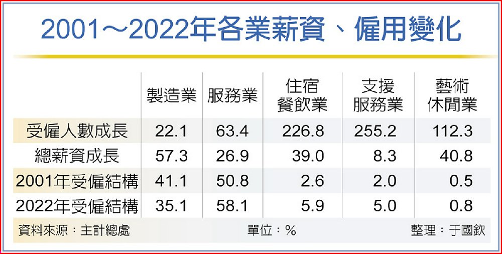 統計顯示,2001年服務業受僱人數占比50.8%,隨著服務業就業機會逐年成長,2022年這個比重已升至58.1%,這意味著近21年來釋出就業機會最多的是服務業,尤其是住宿餐飲業、支援服務業21年來受僱人數成長逾2倍,藝術休閒娛樂業也成長逾1倍,諷刺的是,這些就業機會成長逾倍的行業,偏偏又是薪資成長最緩慢的行業,如此加權平均之後,自然會拉低平均薪資,如此,台灣焉得不低薪?