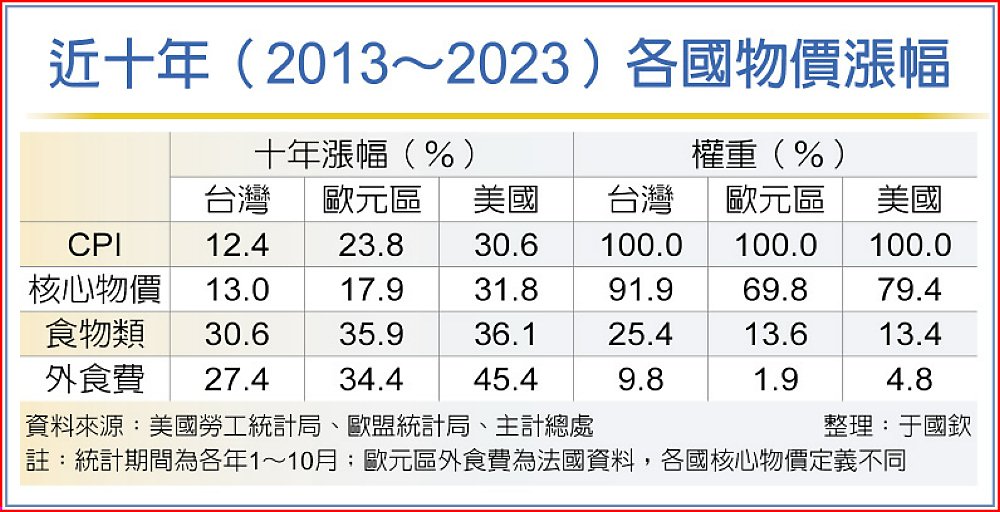 也許有人會問,是不是只有台灣有這個現象?非也,全世界都是如此,近十年歐元區的消費者物價漲了24%,同期間食物類也漲了36%,美國十年來消費者物價漲30%,而食物類也漲了36%,食物類價格不論在那一個國家,漲得都厲害,都比較有感。