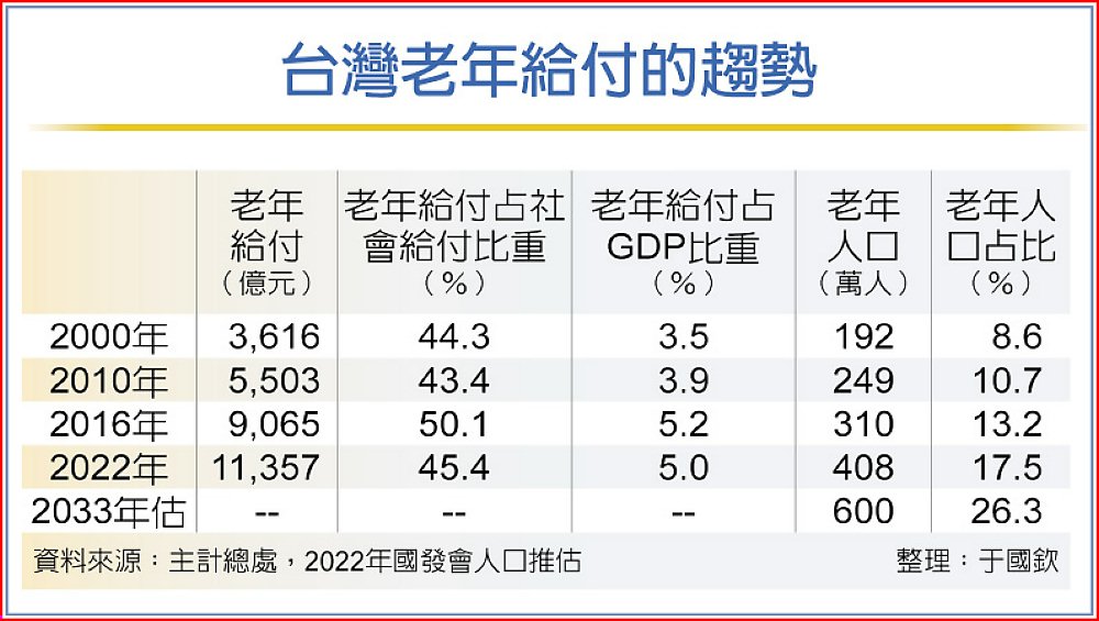 2000年老年人口不到200萬,2022年已倍增至408萬,依國發會推估10年後,也就是2033年將達600萬,屆時老年給付必然更加沉重,依目前的給付水準推計,這一年要支付的金額高達1.6兆。