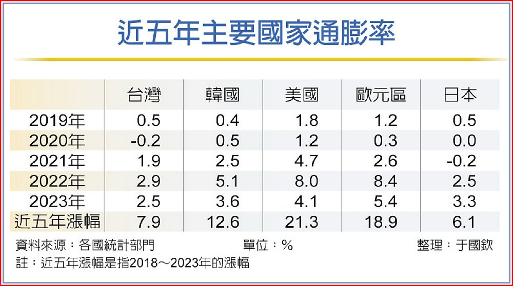 真的不是通膨嗎?我們再比一下近五年各國物價漲勢,看看我們通膨壓力是否比人家大,結果發現2018~2023五年之間,美國漲了21.3%,歐元區也漲了18.9%,韓國漲12.6%,我們只漲了7.9%,因此不論是一年或五年,我們的通膨壓力都比人家小很多。