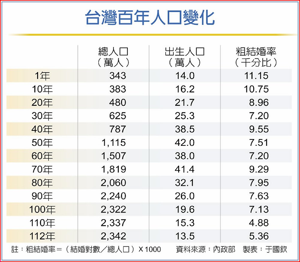 台灣今天落到這般處境,年輕人結婚意願低落是重要原因,依內政部統計,近43年(70~112)我們的結婚率已由千分之九降至千分之五,婦女生第一胎的年齡也由23歲延至32歲,如此一年出生的寶寶從昔日40萬降至如今13萬,以致人口負成長,也就不意外了。