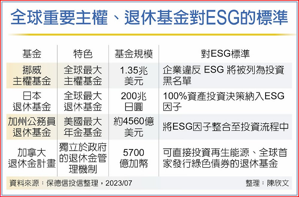 根據調查,全球知名基金如挪威主權基金、日本退休基金、加州公務員退休基金、加拿大退休金計畫等加總規模高達上兆美元,皆訂定嚴格的ESG投資標準,已成為主導全球ESG投資的標竿,除了投資決策納入ESG因子,若不符合ESG規定之企業,甚至會被這些國際基金列為黑名單並遭撤資。