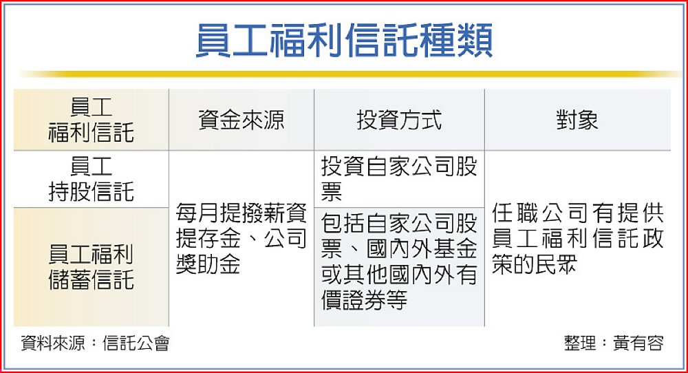 「員工福利信託」是公司為留住人才並提升企業向心力,以成立信託的方式,協助員工累積個人財富,其中又包括「員工持股信託」與「員工福利儲蓄信託」兩個類型。「員工持股信託」是將每月提撥的信託資金,包括薪資提存金及公司獎助金,投資自家公司股票;而「員工福利儲蓄信託」除了投資自家公司股票外,還包括國內外基金或其他國內外有價證券等;員工一旦加入,除退休、離職或經公司持股會、福儲會同意,不得將所投資的信託資產領回。