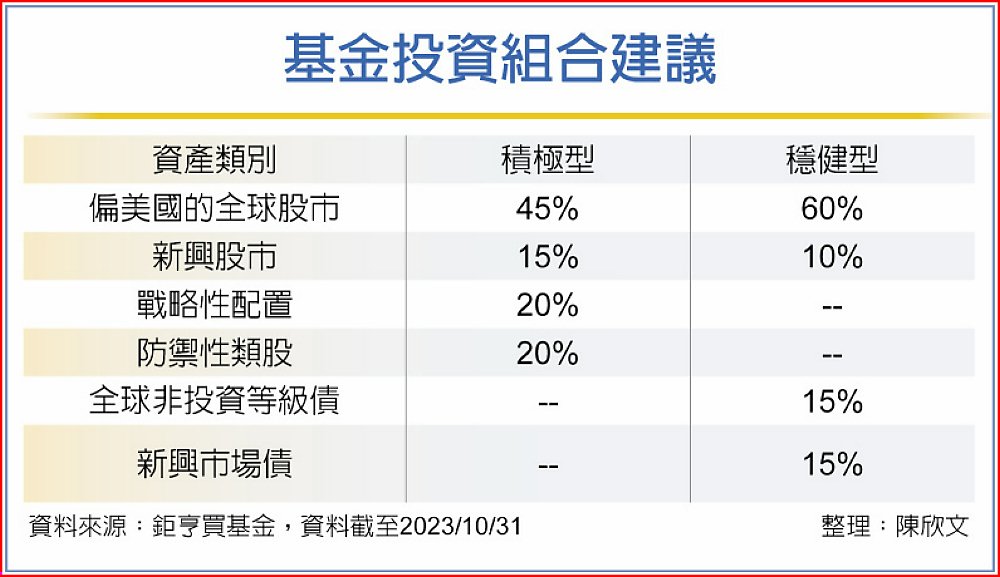 投資屬性偏穩健的投資人可考慮以70%股票基金搭配30%債券基金,其中,債券基金可選擇跟景氣連動較高的全球非投資等級債券和新興市場債券基金。若投資心態更為保守者,則可布局全球綜合債券或投資等級債券做為主要投資的債券基金。