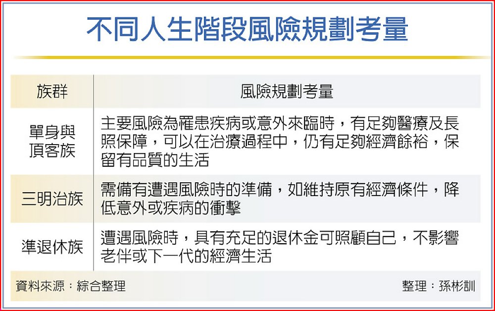 針對這些單身與頂客族,建議風險規劃,以罹患疾病或意外來臨時,有足夠的醫療及長照保障為考量,可以在治療的過程中,仍有足夠的經濟餘裕,保留有品質的生活。而需要養家活口的標準的三明治族群,更需要保障自己未來,維持經濟水平的能力,才足以支應家庭支出與開銷。