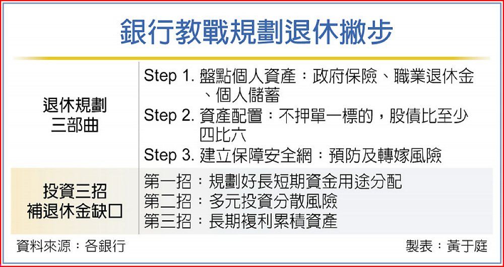 國泰世華銀行表示,在初步計算出退休所需金額後,第一部曲就需要先盤點資產,也就是退休三大支柱,包括政府的保險制度、職業退休金,以及個人儲蓄與投資。第一支柱「政府保險」,如勞保、國民年金等制度,包含傷害、殘廢、生育、死亡及老年給付,以勞保為例,在職勞工依規定支付勞保費用,離職退保且符合勞工保險老年給付請領資格時,即可申請一次提領或以年金方式每月提領。