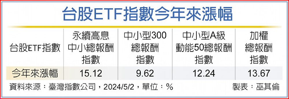 台新臺灣永續高息中小型ETF基金(00936)經理人黃鈺民表示,美國通膨降溫趨緩,致Fed言論偏向鷹派,導致近期美股及台股震盪加大。但中長線來看,今年為美國總統選舉年,歷史經驗來看股市不致太差,配合台股企業獲利有機會成長二位數,台股中長線漲升行情可期,建議定期定額投資台股ETF,並以又結合「中小」、「永續」及「高息」三題材之台股ETF為布局首選,短線動能強勁,長線報酬可觀,可享有樂活的退休生活。