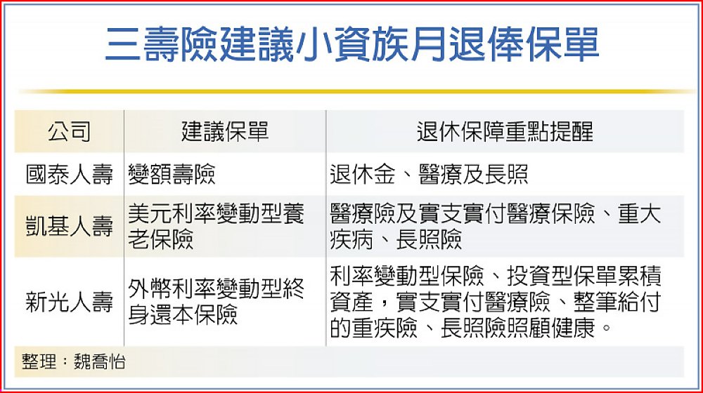 國泰人壽舉例,以30歲的女性投保國泰人壽基優人生變額壽險為例,在資產累積期間以低額度定期定額投入資金,不僅能參與市場投資收益,也能享有充足的身故保障,建議首筆資金投入配息型基金,續期採定期定額方式,月繳1萬元投入累積型基金,期間亦可根據個人理財規劃適時調整基金投資比例,若以年化報酬率5%計算,60歲退休時可累積約870萬元的退休金,即可達成退休後月領3萬元的目標,以支應退休後20餘年的生活。