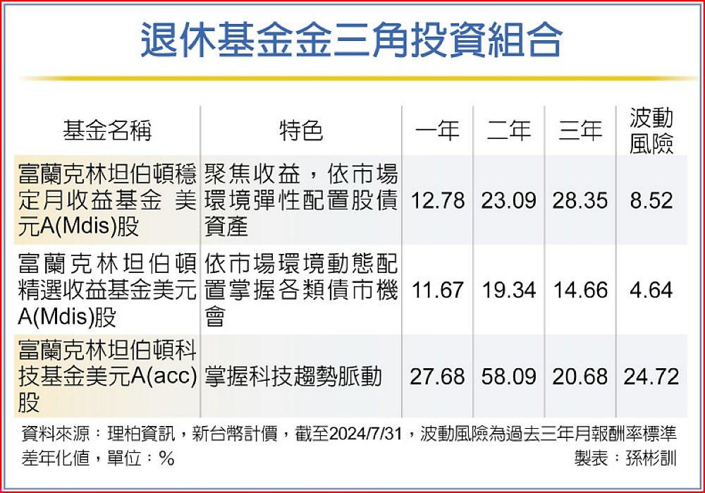 而退休族如果也想多點參與股市投資,不妨從收益型債券與平衡基金每月配息中撥一部分定期定額投資於長線趨勢機會的科技股票型基金,分享長期潛在資本利得機會,達到「進可攻、退可守」的理財加乘效果。