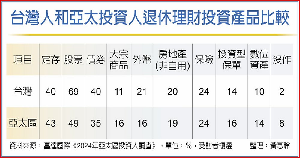 因此在富達國際《2024年亞太區投資人調查》也發現,台灣受訪者中有近6成(59%)計畫於退休時繼續投資,逾四成(42%)表示會從現在開始增加目前儲蓄的計畫,以及近4成(37%)打算退休後進行兼職的工作。
