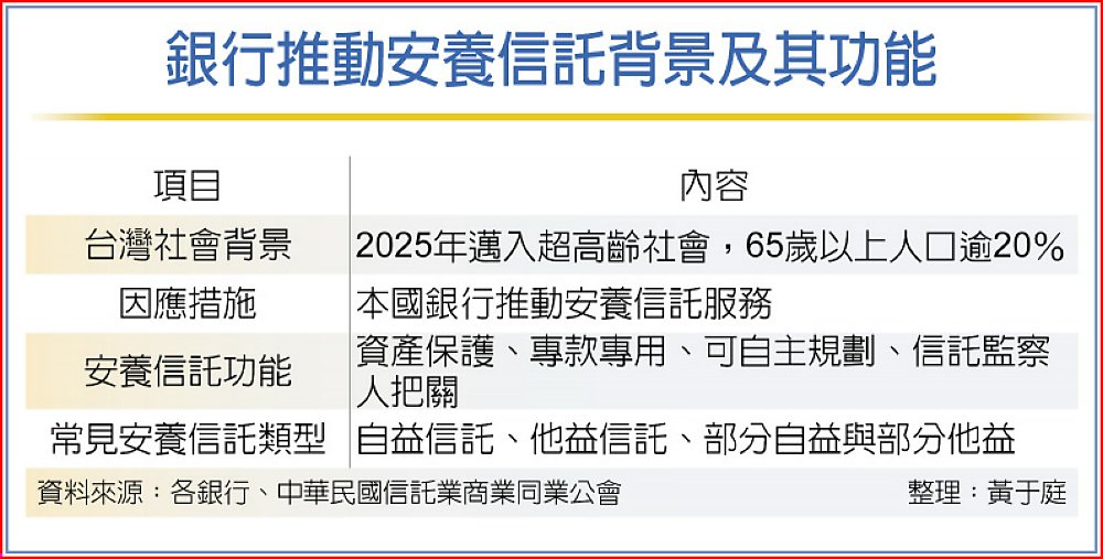 永豐銀行表示,安養信託主要有四大功能,一是資產保護,即信託財產具安全、獨立性,避免遭他人覬覦或侵占;二是專款專用,即由受託人依約定或指示代為給付生活費、看護或醫療等費用,保障未來生活經濟來源,免除後顧之憂;三是自主規劃,即信託財產可視委託人狀況約定適當、有效率的運用方式,例如,存款、投資基金等有價證券;四是信託監察人把關,可指定親友、專業人士或社福團體擔任,監督受託人信託事務之執行是否符合受益人利益。